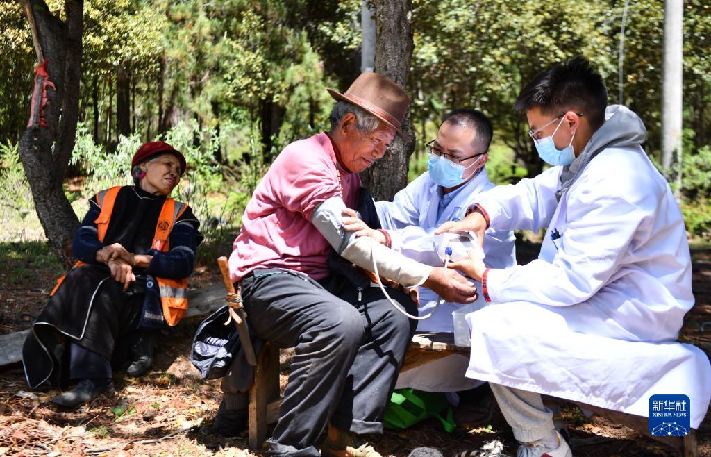 6月12日,王振疆(右)為吞不絨村89歲的村民娘姑進(jìn)行檢查。新華社記者 費(fèi)茂華 攝