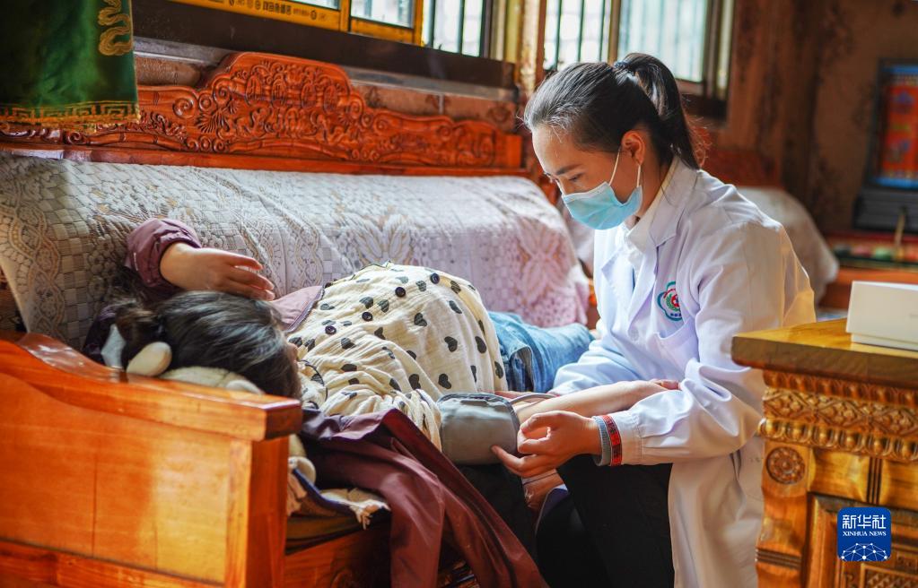 6月12日,王旭彤醫(yī)生在給珠杰檢查身體。新華社記者 晉美多吉 攝
