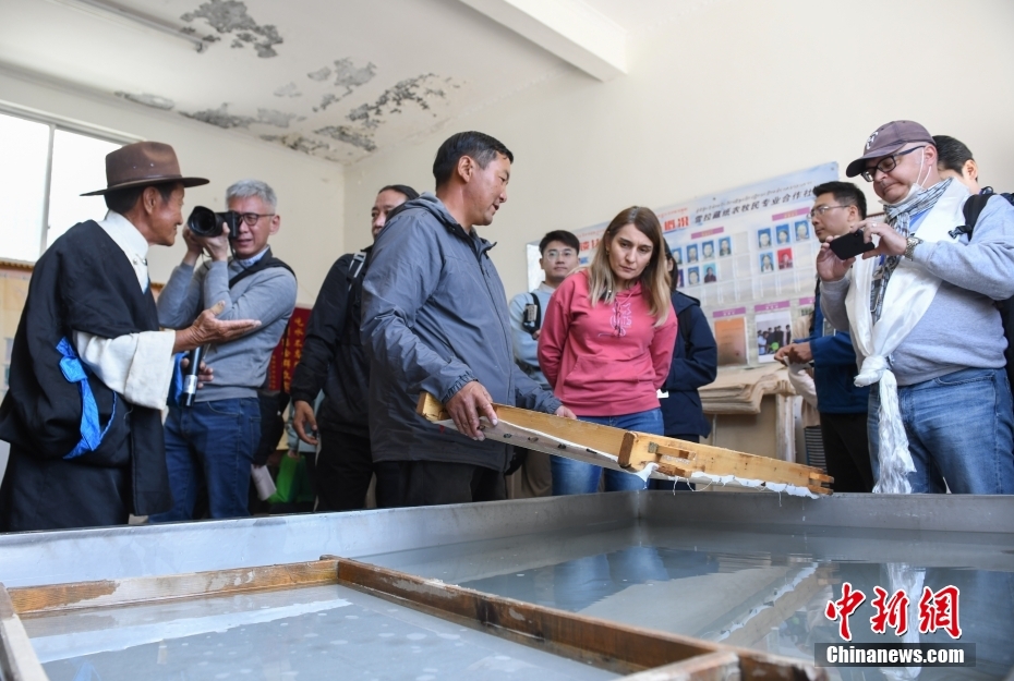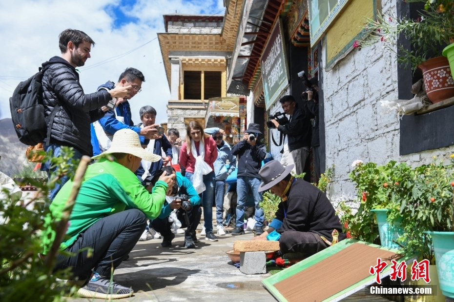 6月15日,西藏拉薩,記者們在尼木縣非遺工坊(藏紙制作廠)采訪了解藏紙。在第五屆中國西藏旅游文化國際博覽會召開之際,國務(wù)院新聞辦組織中外媒體記者赴西藏采訪,路透社、共同社、西班牙埃菲社、意大利安莎社、新加坡《聯(lián)合早報(bào)》和中央廣電總臺、中國日報(bào)等15家媒體的20名記者參加。6月15日,采訪團(tuán)一行前往拉薩市尼木縣參訪體驗(yàn)西藏傳統(tǒng)藏香、藏紙文化。