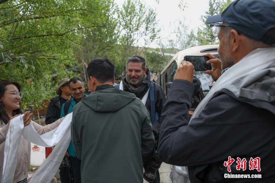 6月15日,西藏拉薩,尼木縣吞巴鎮(zhèn)吞達(dá)村村民給來訪記者們敬獻(xiàn)哈達(dá),表示歡迎。在第五屆中國西藏旅游文化國際博覽會召開之際,國務(wù)院新聞辦組織中外媒體記者赴西藏采訪,路透社、共同社、西班牙埃菲社、意大利安莎社、新加坡《聯(lián)合早報(bào)》和中央廣電總臺、中國日報(bào)等15家媒體的20名記者參加。6月15日,采訪團(tuán)一行前往拉薩市尼木縣參訪體驗(yàn)西藏傳統(tǒng)藏香、藏紙文化。