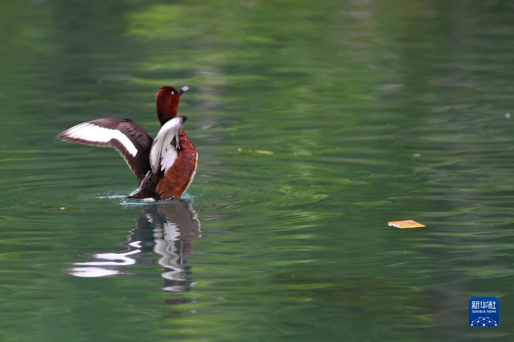 白眼潛鴨在拉魯濕地中干渠里舒展翅膀(6月14日攝)。新華社記者 張汝鋒 攝