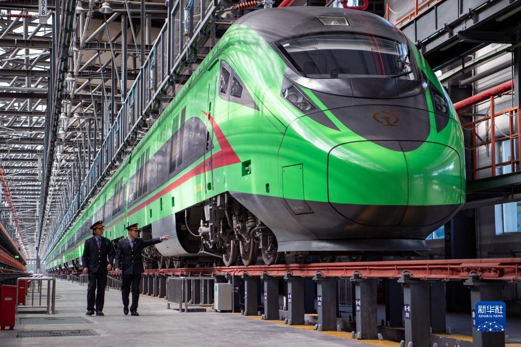 在拉薩機(jī)輛整備中心,“復(fù)興號”動車組在檢修庫進(jìn)行整備作業(yè)(1月11日攝)。新華社記者 孫非 攝