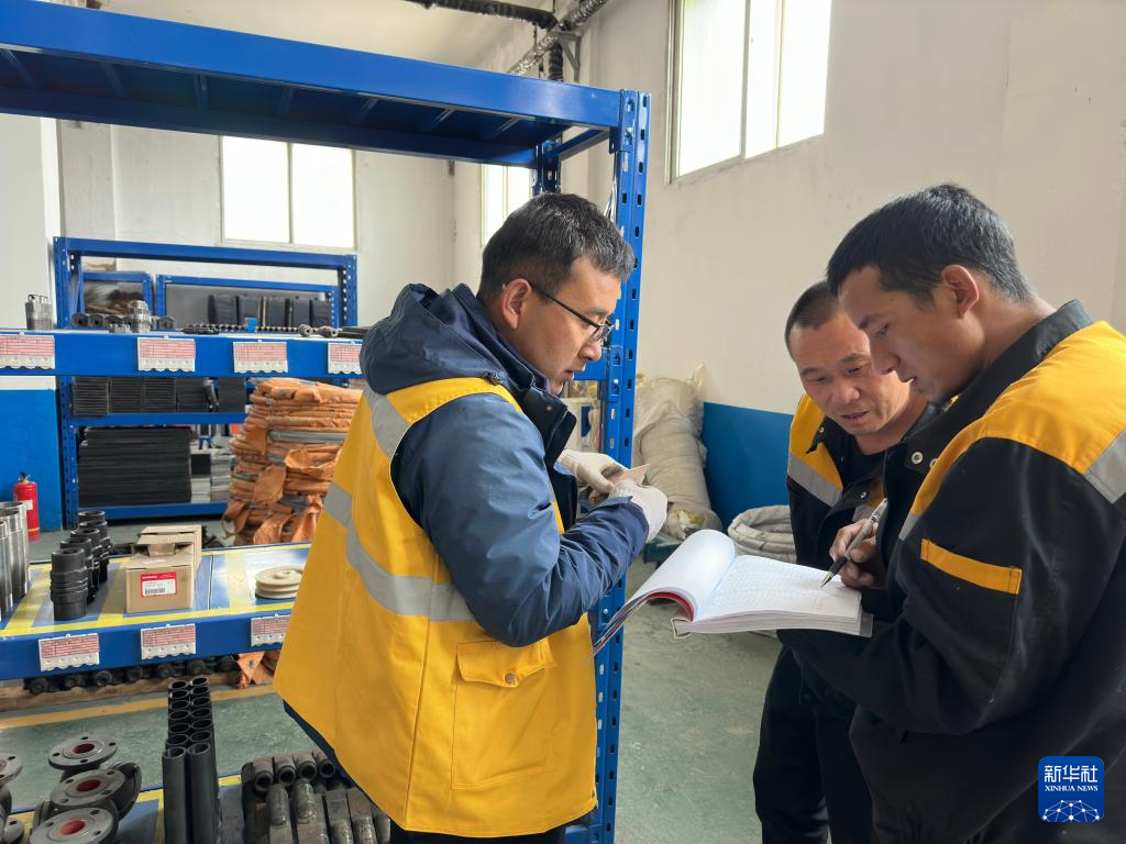 高錢勝(左一)和同事在材料庫核對應(yīng)急搶險備品。受訪者供圖