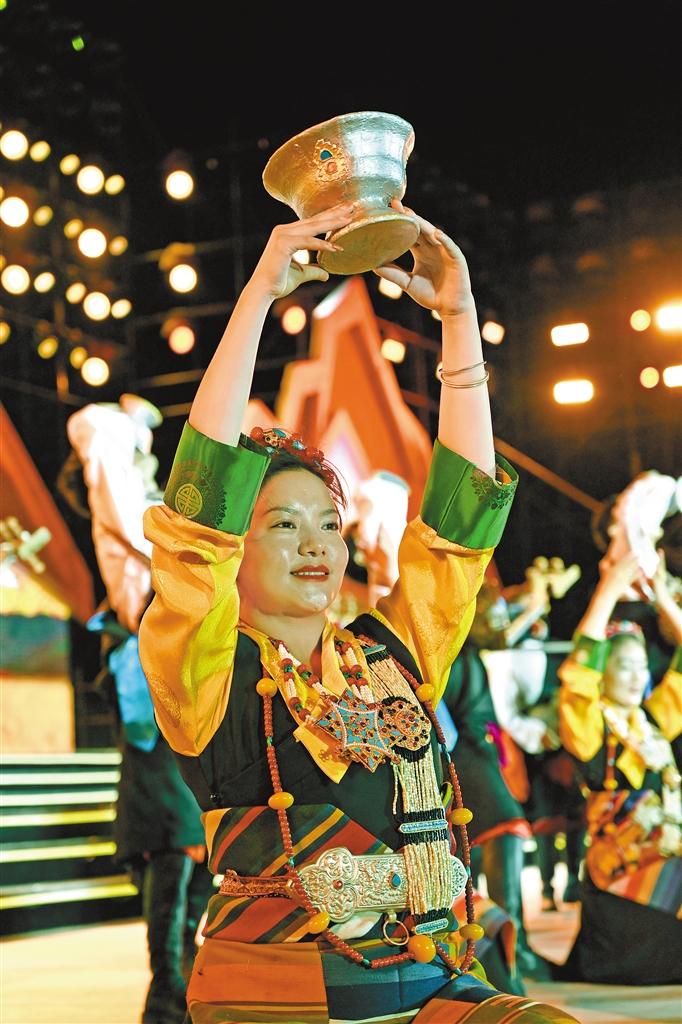 聲,是情的流露;舞,是意的表達(dá)。開幕式文藝表演由序《珠峰頌歌》、上篇《戀上青稞》、下篇《極境暢想》和尾聲《吉祥日喀則》組成。序《珠峰頌歌》中,150名演員深情合唱歌曲《珠穆朗瑪》,表演節(jié)奏歡快的男女踢踏舞等,展現(xiàn)日喀則高質(zhì)量發(fā)展的加速度和拼搏奮進(jìn)的精氣神。上篇《戀上青稞》,展示日喀則各族群眾勤勞、樂觀、向上的精神風(fēng)貌和獨(dú)具魅力的地域文化。下篇《極境暢想》,以青稞美酒作為表現(xiàn)載體,以游客的視角介紹日喀則文旅資源,并通過藏戲和昆曲等多種文化藝術(shù)碰撞,展示日喀則在打造面向南亞大通道的發(fā)展機(jī)遇中,廣泛開展對(duì)外開放交流合作。尾聲《吉祥日喀則》,展示日喀則海納百川、開放包容的胸襟和熱情。