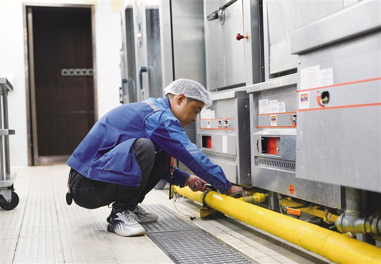 在香格里拉酒店,拉薩暖心公司工作人員對酒店的鍋爐房、廚房等地開展了燃?xì)獍踩[患排查。拉薩暖心公司客戶服務(wù)部抄表中心主任張雁龍手拿檢測儀器,對鍋爐房、廚房內(nèi)的燃?xì)夤艿浪薪涌凇⑷細(xì)庠罹?、軟管、燃?xì)鈭?bào)警器、安全閥等全部進(jìn)行了檢查,并對每一項(xiàng)檢查結(jié)果進(jìn)行了登記。