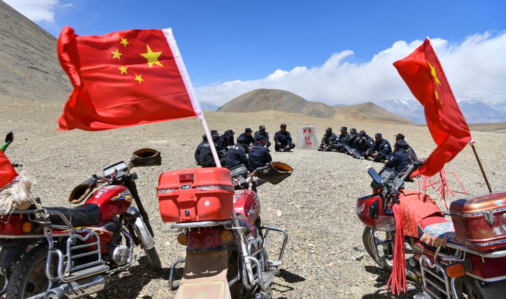 在33號界碑處,護(hù)邊隊在隊長的帶領(lǐng)下開展學(xué)習(xí)(6月2日攝)。新華社記者 晉美多吉 攝