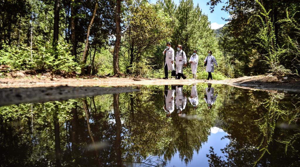 往返于村間的王振疆(左二)與隊員王彤旭(左一)、陳冰(右)及當(dāng)?shù)蒯t(yī)生尼瑪益西(右二)(6月12日攝)。新華社記者 晉美多吉 攝