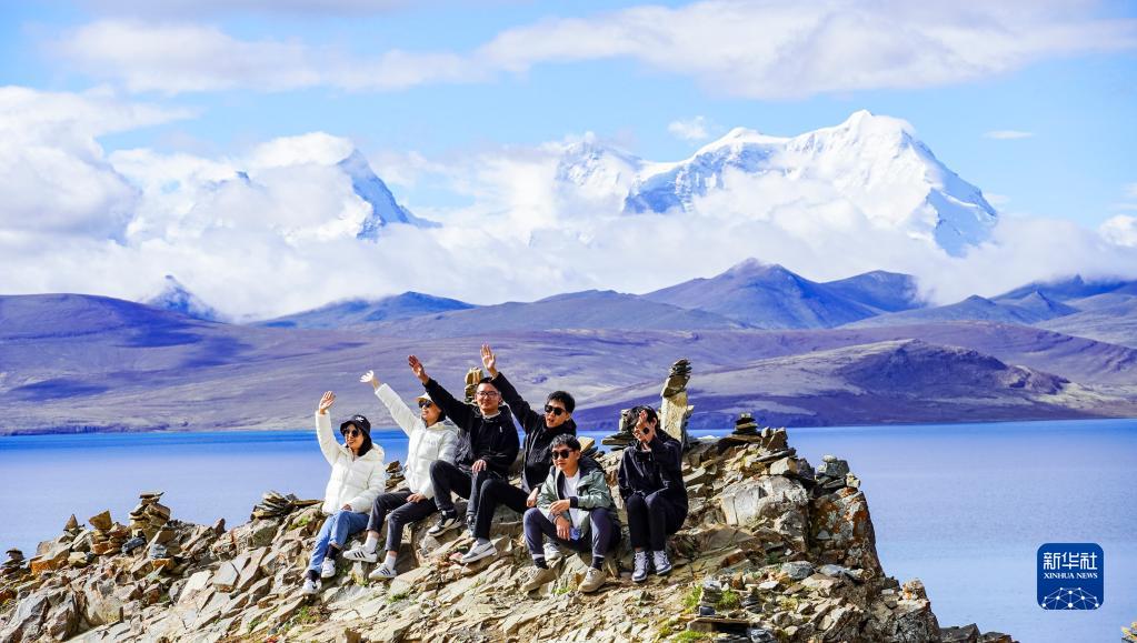 7月4日,游客在普莫雍錯(cuò)湖邊拍照留念。新華社記者 陳尚才 攝