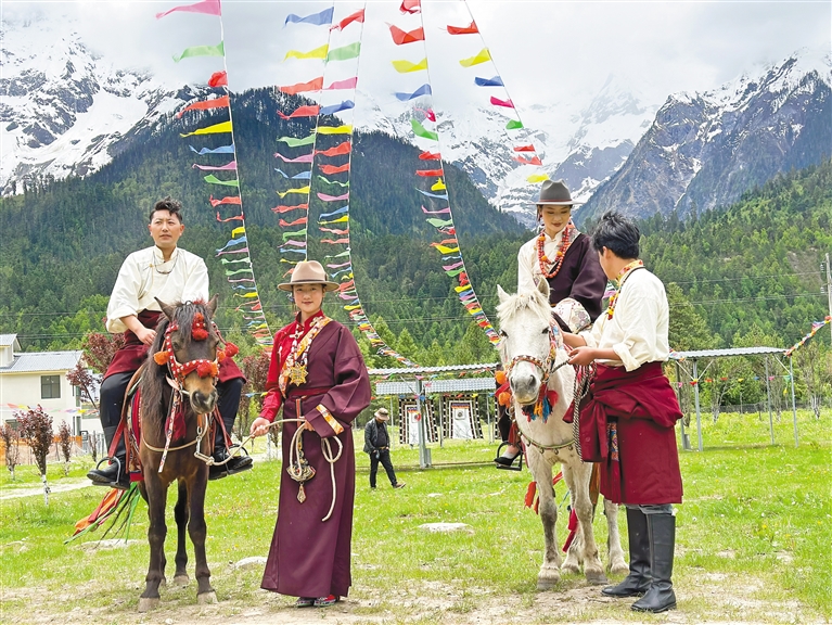 波密縣扎木鎮(zhèn)康木村坐落于318國道旁,風景秀麗,群山環(huán)繞,很多自駕游的游客都會經停于此體驗藏家文化。圖為游客在康木村,穿著藏裝體驗騎馬樂趣。 圖片由記者 張猛 攝