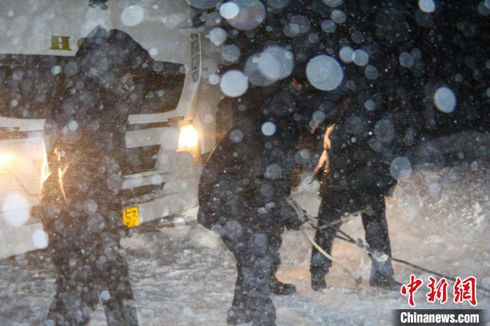 來到現(xiàn)場后楊軍發(fā)現(xiàn),該路段積雪超過半米深,車輛已經(jīng)深陷其中無法行駛。楊軍立即組織民警用鐵鍬鏟雪、人力助推、繩索牽引等進行施救,經(jīng)過一個多小時的努力,成功將部分被困車輛救出??涩F(xiàn)場風雪突然變大,下雪速度遠超過救援速度,轉(zhuǎn)眼間,路面積雪接近1米高,到深夜時,雙向車道上被困車輛、人員已達17輛、49人,看到情況越來越嚴峻,楊軍迅速對接、協(xié)調(diào)駐地交通部隊共同開展救援。