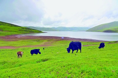 莽錯湖位于芒康縣中部莽嶺鄉(xiāng)境內(nèi),湖面海拔4300多米,水域面積20多平方公里。圖為莽錯湖畔的牦牛群。光明日報記者 畢玉才攝
