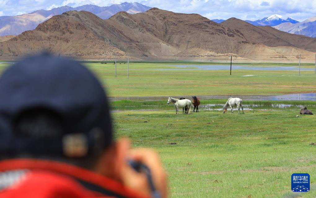 游客拍攝班公湖畔的駿馬(7月28日攝)。新華社記者 關(guān)明輝 攝