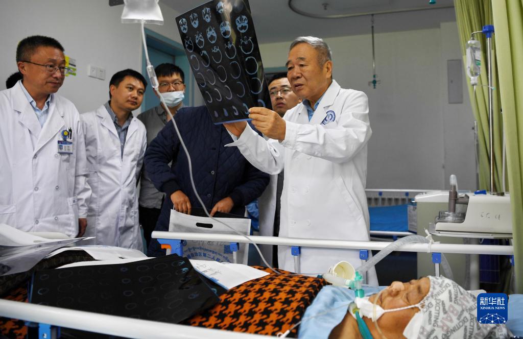 8月10日,中國科學院院士、首都醫(yī)科大學附屬北京天壇醫(yī)院神經外科學中心主任醫(yī)師趙繼宗(后右一)在西藏自治區(qū)第二人民醫(yī)院為患者會診。新華社記者 張汝鋒 攝