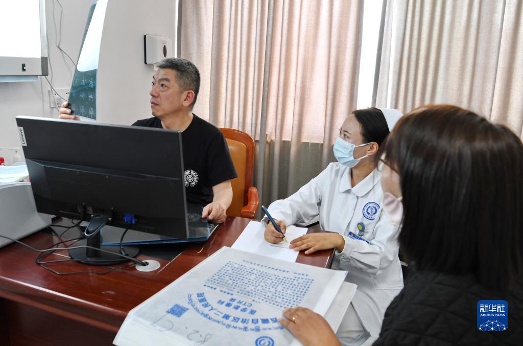8月10日,北京天壇醫(yī)院神經外科學中心主任醫(yī)師隋大立(左)和西藏自治區(qū)第二人民醫(yī)院的醫(yī)生為患者義診。新華社記者 張汝鋒 攝