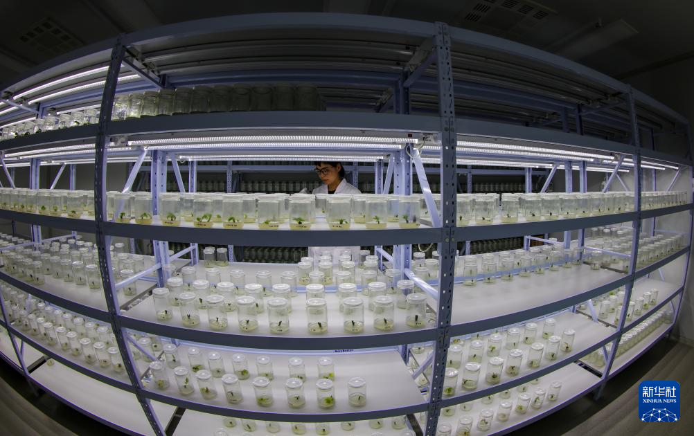劉利平在長(zhǎng)江大學(xué)西藏高原核桃產(chǎn)業(yè)研究所檢查核桃組織培養(yǎng)標(biāo)本(7月27日攝)。新華社記者 姜帆 攝