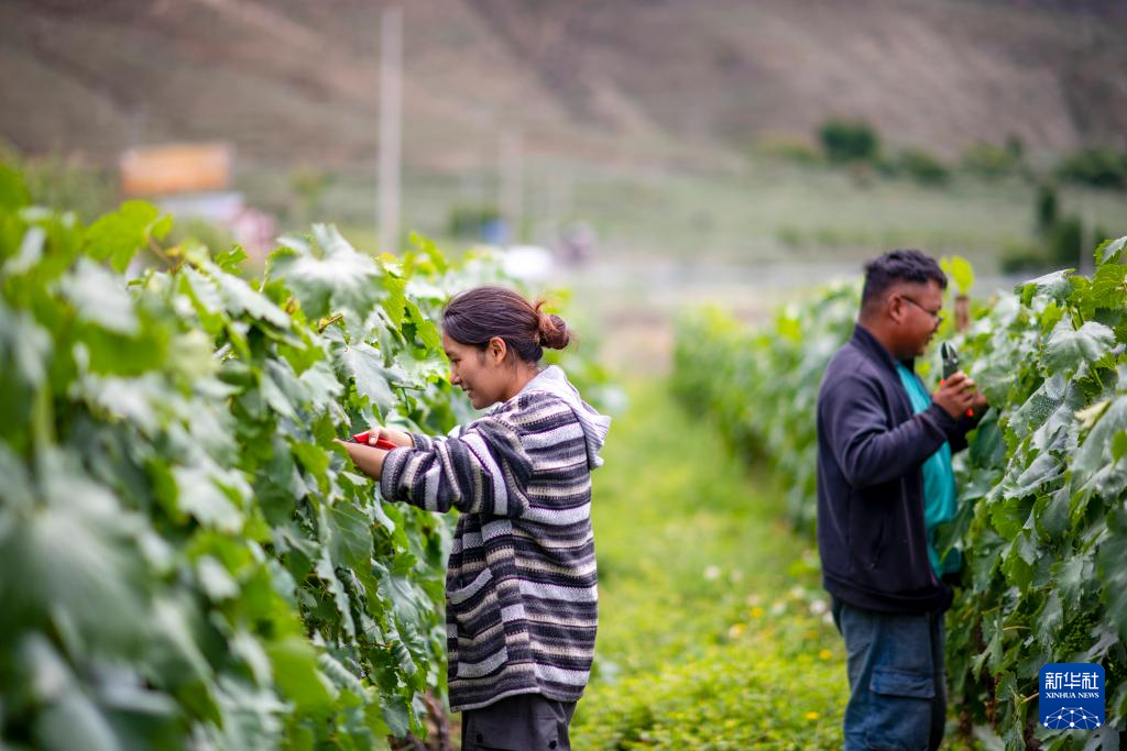 曲珍(左)與同事在葡萄園里進行剪枝操作(7月26日攝)。新華社記者 姜帆 攝