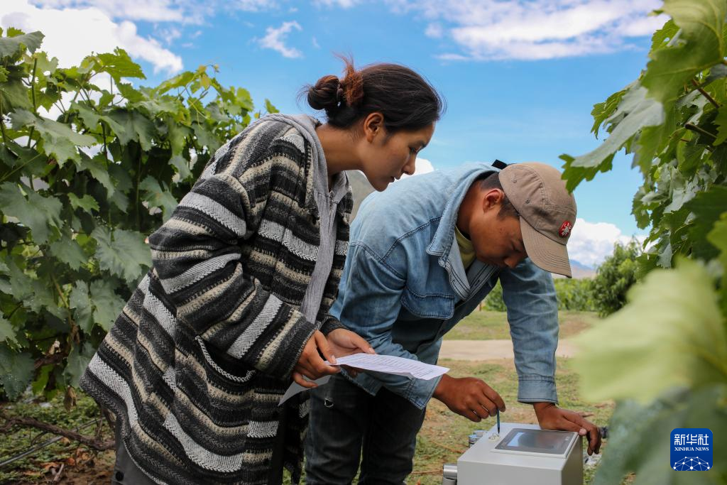 曲珍(左)在葡萄園里向技術(shù)員何志榮學習操作光譜儀(7月26日攝)。新華社記者 姜帆 攝