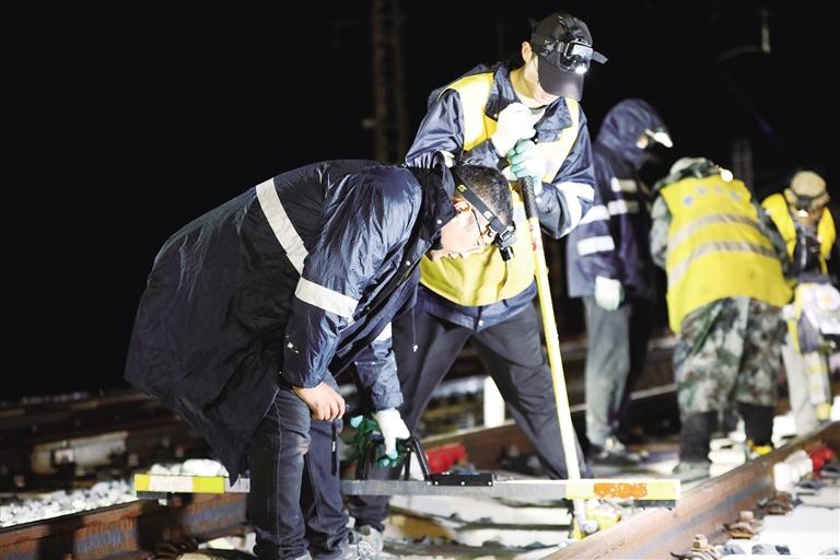 21時30分,作業(yè)中,暴雨傾盆而下,瞬間覆蓋了整個施工現(xiàn)場,噼里啪啦地打在現(xiàn)場作業(yè)人員身上。早已經(jīng)歷過無數(shù)次風雨洗禮的他們,握緊手中的工具,按照分工忙碌起來,有的測量數(shù)據(jù)、有的配合作業(yè)、有的檢查設(shè)備、有的盯控安全……整個作業(yè)現(xiàn)場忙而有序,這場突降的暴風雨,儼然已成為促使他們奮進的鼓點,他們正用昂揚的斗志,奏響高原鐵路人的“天路夜曲”。
