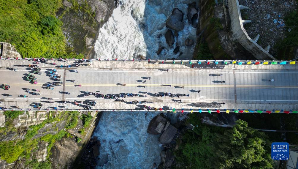 9月1日,往來中尼兩國的人員跨過友誼橋(無人機照片)。新華社記者 聶毅 攝