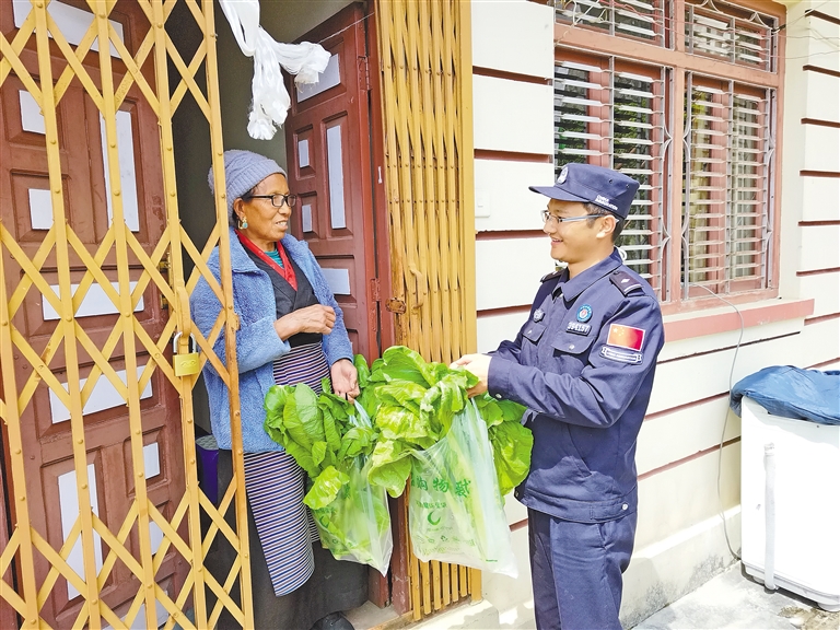 立新邊境派出所民警文昌太給轄區(qū)孤寡老人送去自己種的蔬菜?!D片由日喀則邊境管理支隊(duì)提供