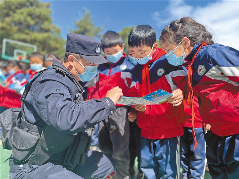 林芝邊境管理支隊(duì)南伊邊境派出所副所長(zhǎng)趙軍為小學(xué)生開(kāi)展安全宣傳,講解民族團(tuán)結(jié)相關(guān)政策。記者 張猛 攝
