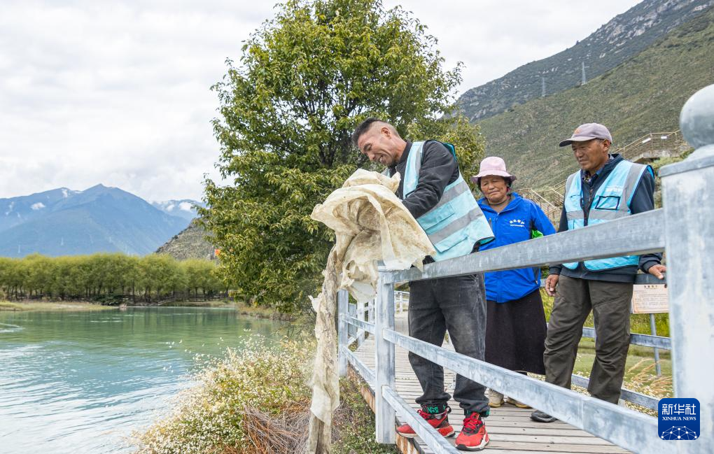 雅尼國(guó)家濕地公園管護(hù)員普布多杰(左)在巡護(hù)途中清理垃圾(9月8日攝)。新華社發(fā)(丁增尼達(dá) 攝)