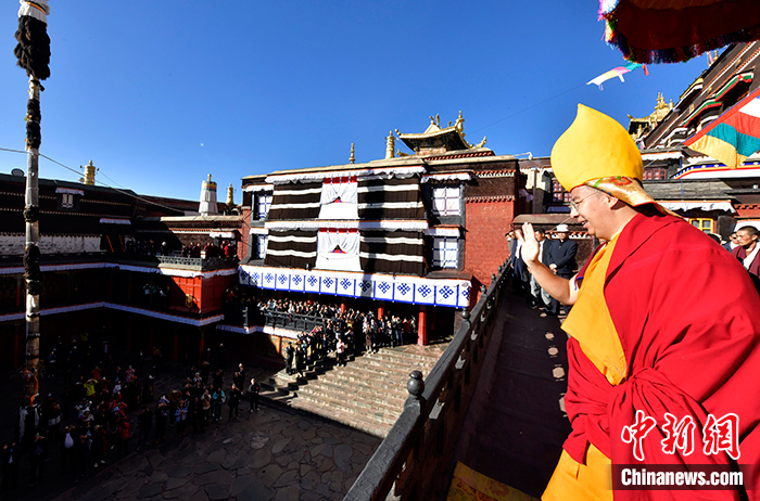 9月13日,班禪在扎什倫布寺向等候的信眾與游客揮手致意。中新社記者 李林 攝