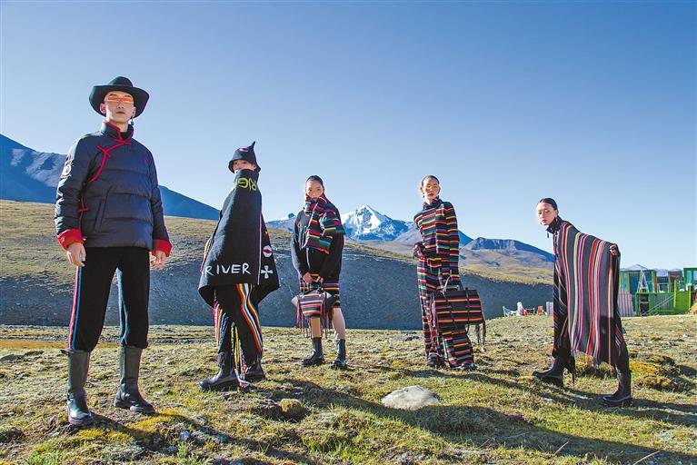 以萬里晴空為幕,以乃欽康桑雪山為背景。隨著富有濃郁藏族風(fēng)情的銅鈴聲響起,模特們身著40套款式各異的創(chuàng)新氆氌工藝服飾,陸續(xù)登場,為觀眾呈現(xiàn)了一場震撼心靈的視覺盛宴。