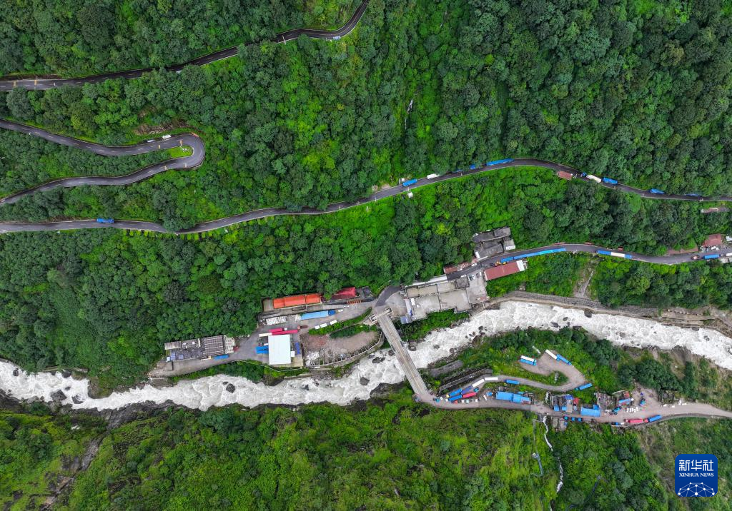 俯瞰樟木口岸的中尼友誼橋和通向樟木鎮(zhèn)的盤(pán)山公路(無(wú)人機(jī)照片,9月9日攝)。新華社記者 姜帆 攝