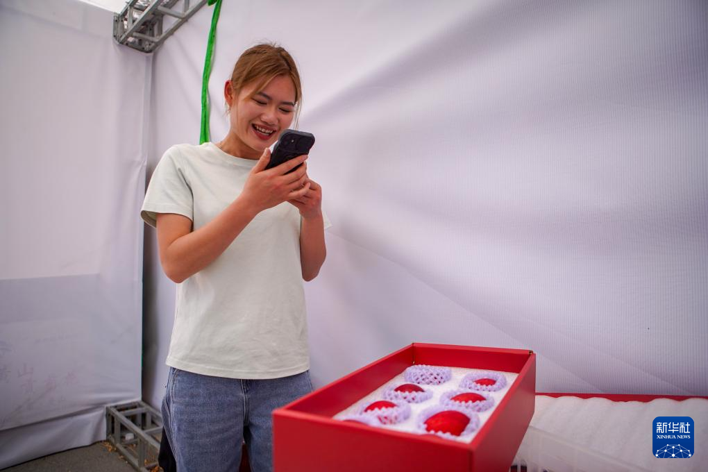 廖小明正通過(guò)網(wǎng)絡(luò)直播銷(xiāo)售“高原紅”蘋(píng)果。新華社記者 邵澤東 攝