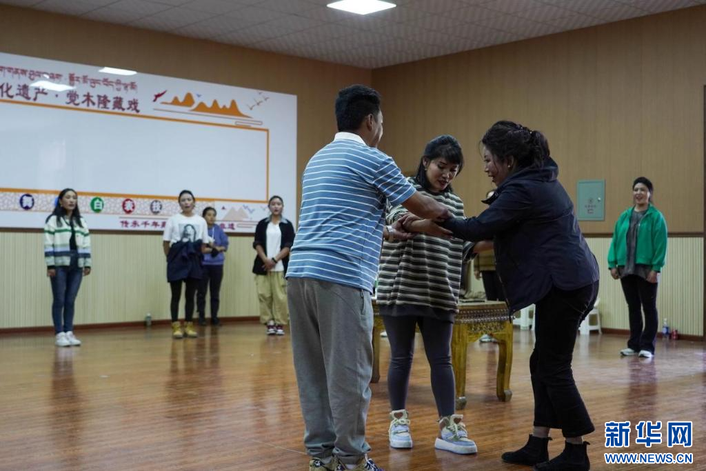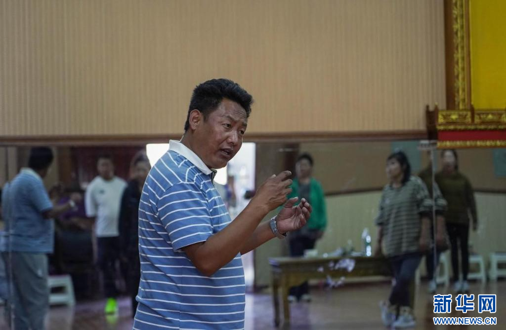 “像這樣,動作幅度大一點,我們再來一次?!迸啪毷依?,西藏自治區(qū)級非物質(zhì)文化遺產(chǎn)傳承人、覺木隆藏戲傳承人洛桑扎西正糾正演員們的動作,伴隨著有力的鼓點,藏戲《白瑪文巴》的排練正在進行。