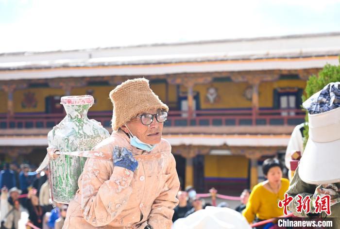 10月18日,背著涂料排隊(duì)準(zhǔn)備粉刷布達(dá)拉宮的民眾。中新社記者 趙朗 攝
