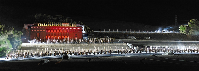 星空為幕,山川為景,氣勢恢宏,震撼心靈。直抵人心的音樂聲響起,歡快的果卓鼓聲震天,熱情的篝火升騰;打阿嘎的搗地之聲,古老藏戲的婉轉(zhuǎn)傳唱,甲諧的豪情奔放……恢弘的布達(dá)拉宮布景前,“文成公主”和“松贊干布”穿越千年而來,再現(xiàn)漢藏和美的動(dòng)人傳奇。