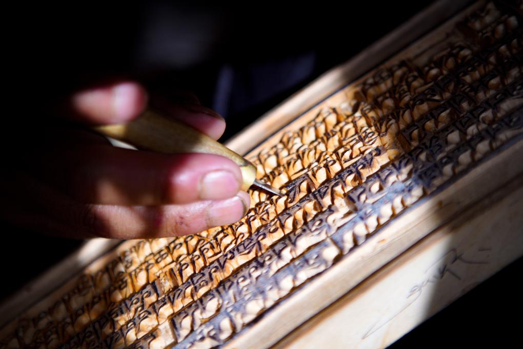 波羅刻版制作并不容易,包括切割、曬油、加固等十多道工序。澤培說:“我們一般選用優(yōu)質的紅樺樹,必須要耐磨、沒有裂縫。正式刻制時,每一個字都必須與模板相對應,不能跑偏、變形。要想雕刻好,需要熟練掌握藏文書法等相關知識。一個字刻壞了,整個作品就毀了?!?/p>