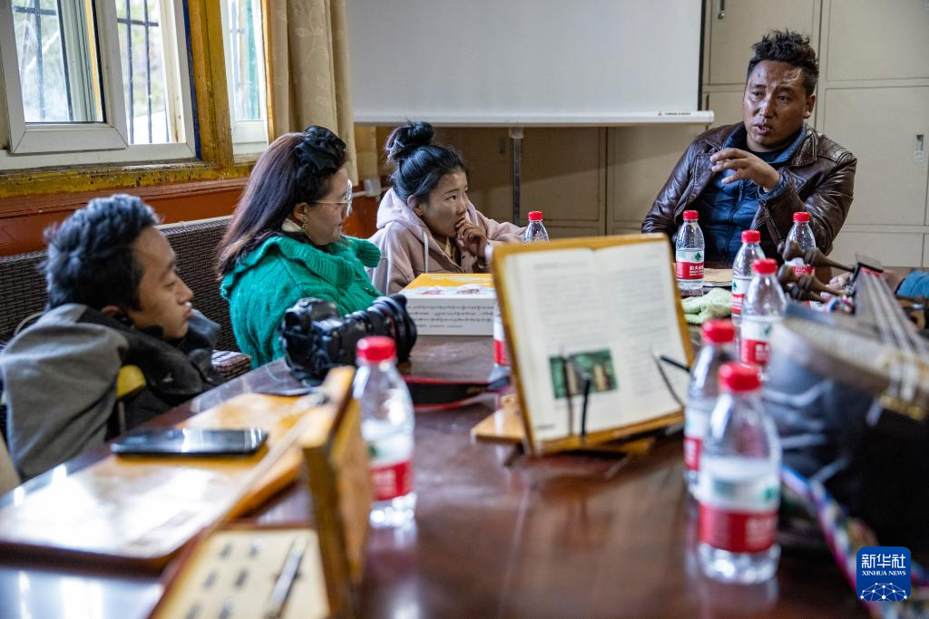 西藏拓崗文化傳播有限公司負(fù)責(zé)人覺列(右一)在直播前與直播團(tuán)隊(duì)討論直播方案(11月10日攝)。新華社記者 姜帆 攝
