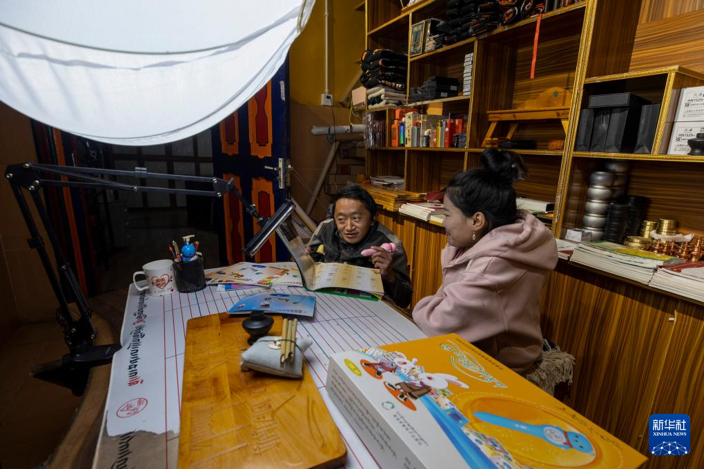 西藏拓崗文化傳播有限公司員工拉巴頓珠(左)與主播索朗德吉合作直播銷售藏語學(xué)習(xí)文具(11月10日攝)。新華社記者 姜帆 攝