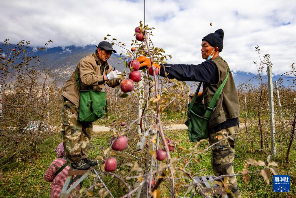 米林市羌納鄉(xiāng)西藏林芝現(xiàn)代蘋果標(biāo)準(zhǔn)化園區(qū)內(nèi),農(nóng)民在采摘蘋果(11月13日攝)。新華社記者 姜帆 攝