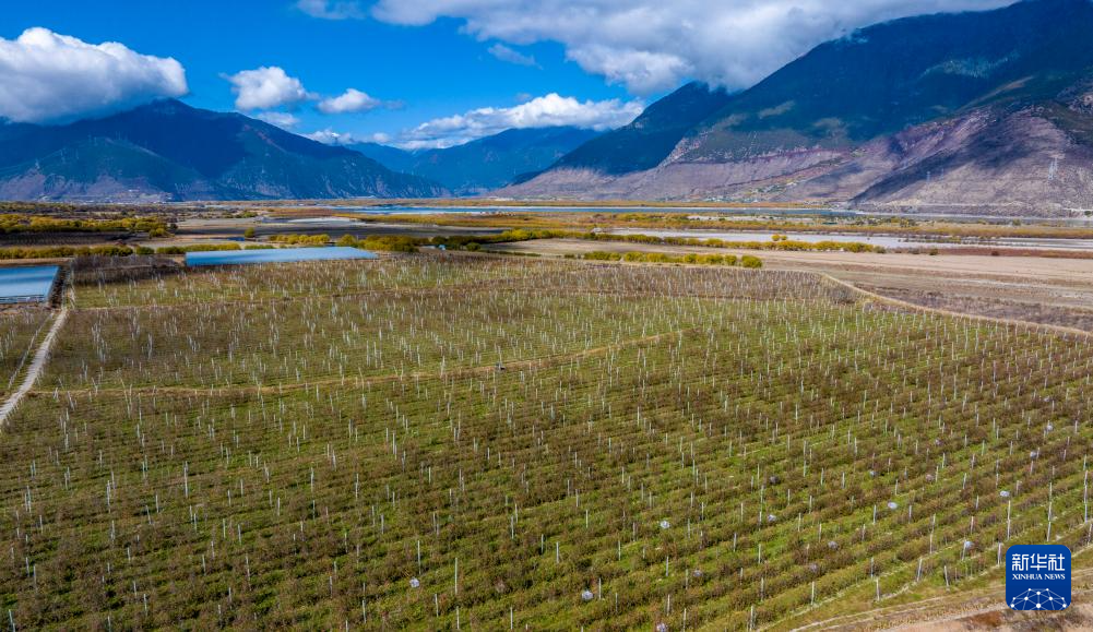鳥(niǎo)瞰米林市羌納鄉(xiāng)西藏林芝現(xiàn)代蘋果標(biāo)準(zhǔn)化園區(qū)(無(wú)人機(jī)照片,11月13日攝)。新華社記者 姜帆 攝
