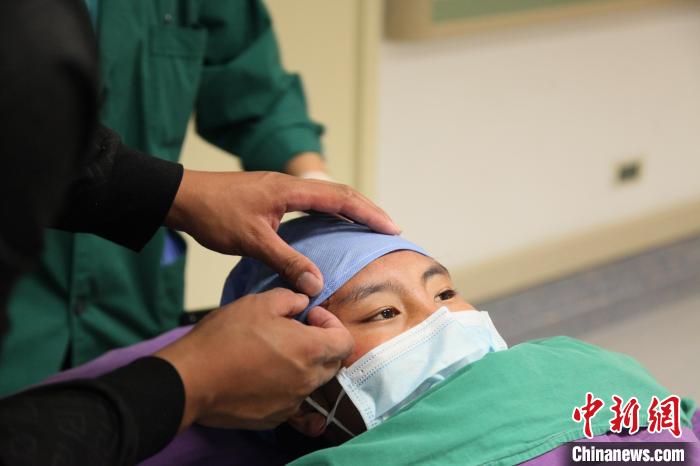 11月21日上午,扎著兩只麻花辮的澤巴永宗即將在北京大學第一醫(yī)院接受脊柱側(cè)凸矯形手術(shù),要進手術(shù)室時,哥哥貢布鄧珠幫她將額角的頭發(fā)掖進手術(shù)帽中。中新網(wǎng)記者 朱賀 攝