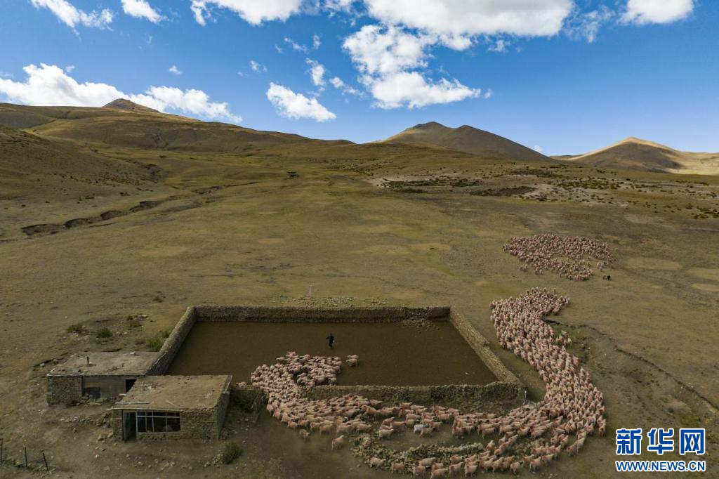 扎西松多村集體養(yǎng)殖的千只綿羊(無人機照片)。新華網(wǎng) 旦增努布 攝
