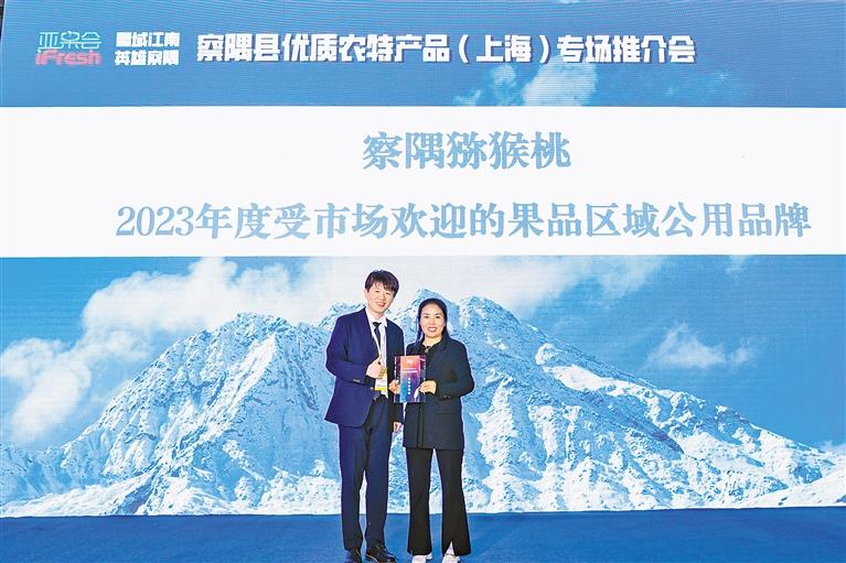 察隅獼猴桃獲得第十六屆iFresh亞洲果蔬產業(yè)博覽會“2023年度受市場歡迎的果品區(qū)域公用品牌”的榮譽。 圖片由本報記者 謝筱純 王珊 攝