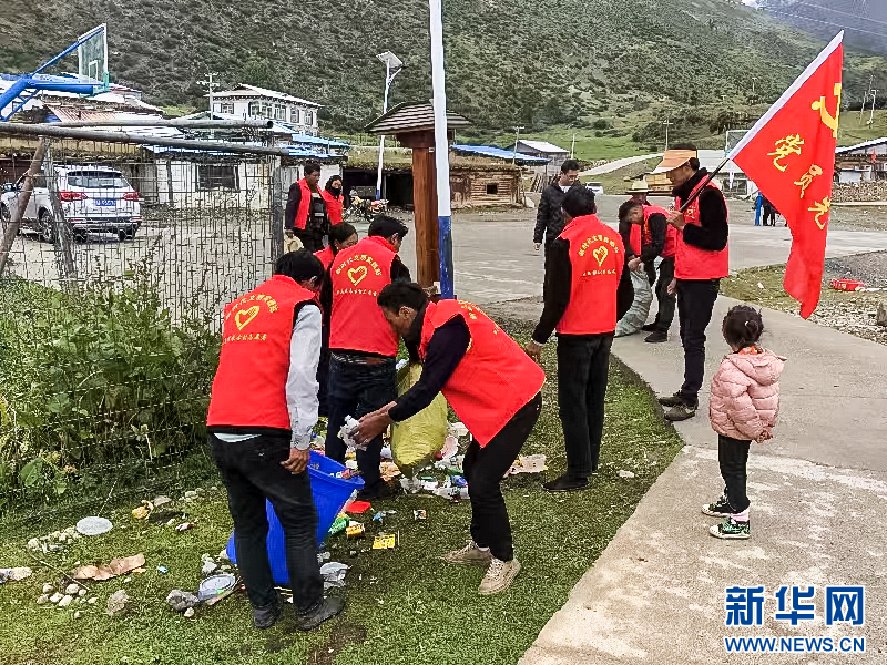 西藏昌都八宿縣然烏鎮(zhèn)來古村組織“冰川上的紅色家園”志愿服務(wù)隊(duì)開展環(huán)境整治活動(8月5日攝)。新華社發(fā)