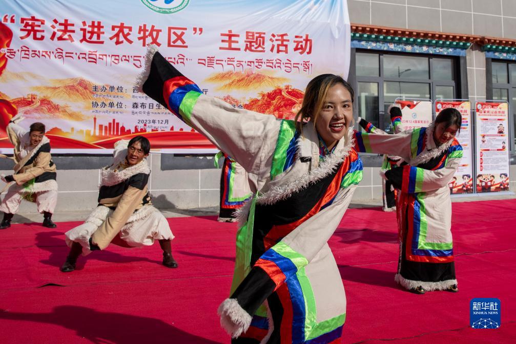 12月6日,森布日生態(tài)搬遷安置點的群眾在“憲法進農牧區(qū)”主題活動上表演歌舞。新華社記者 姜帆 攝