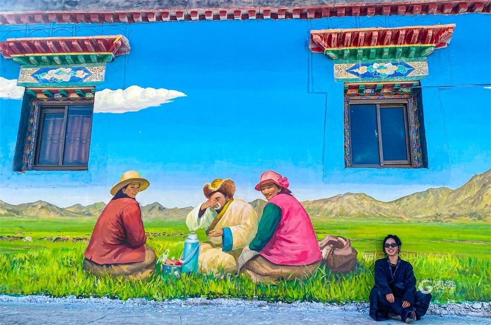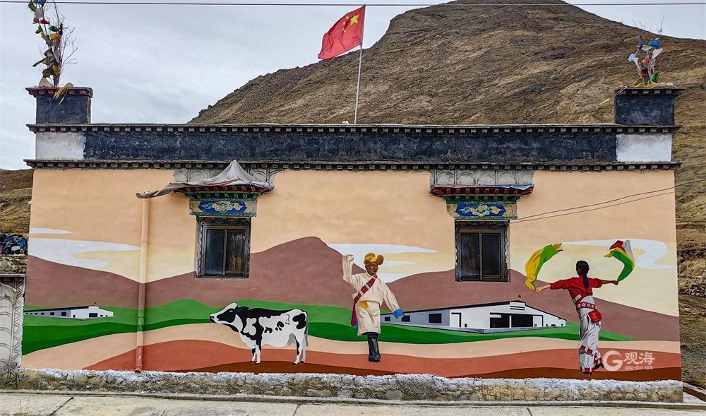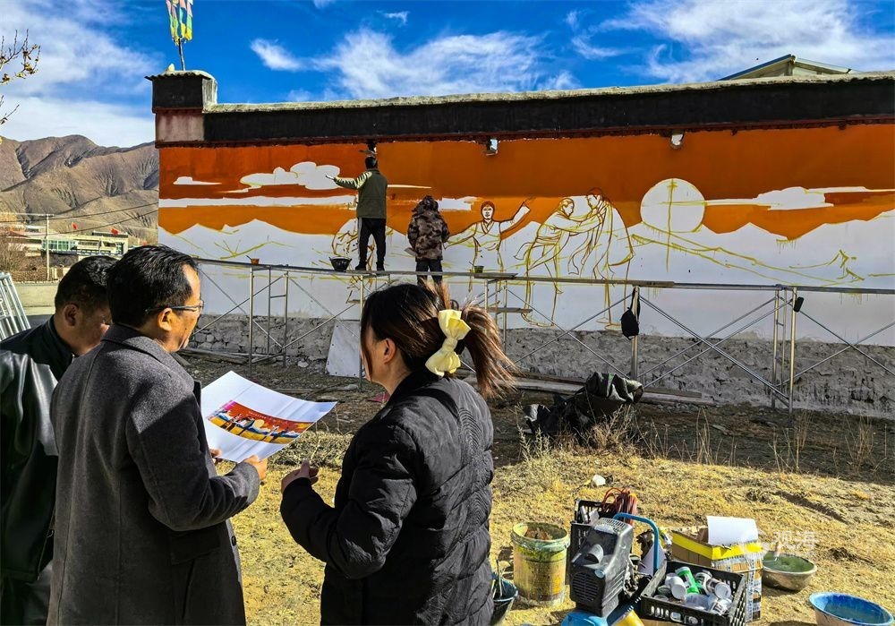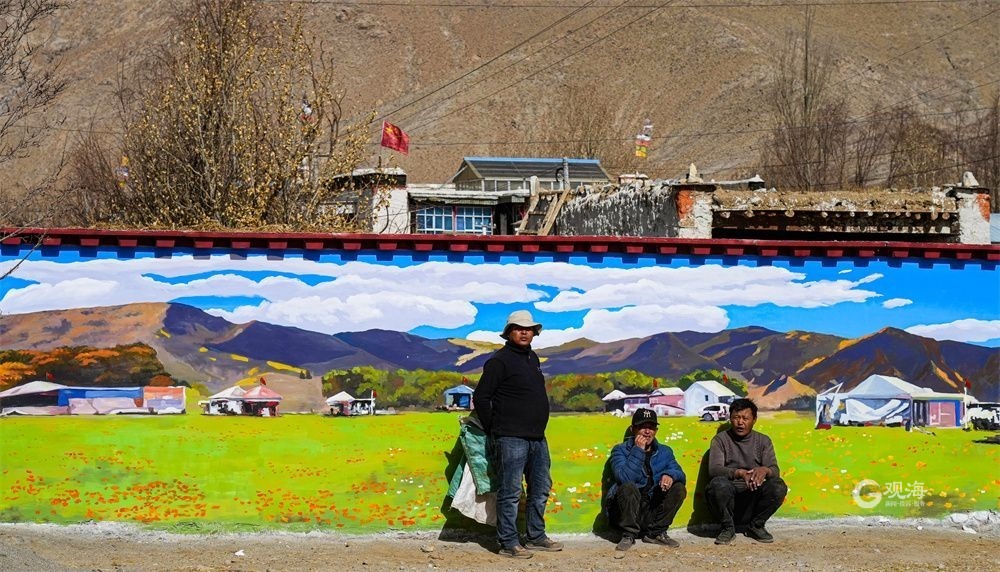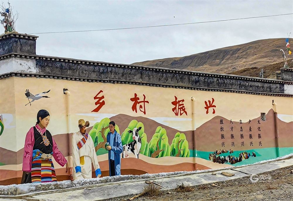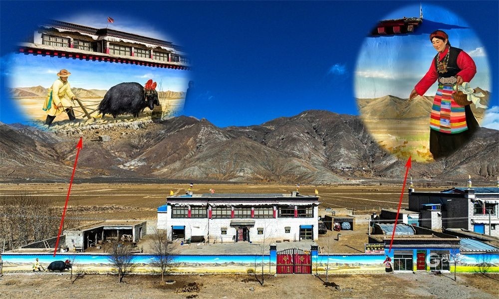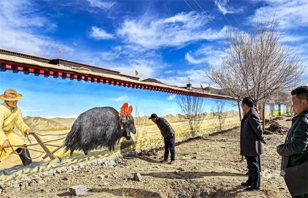廣袤的高原上,在連綿起伏的山巒之下,是藏族農家趕著傳統(tǒng)的“二牛抬杠”耕耘的場景,旁邊的“阿佳”則撒下希望的青稞種子……這樣的場景當然不會出現在現在這個滴水成冰的季節(jié),而是躍然于藏家傳統(tǒng)村居的院墻之上?!拔壹疫@面墻原來就是貼滿了牛糞,現在畫上了我們平時勞動的景象,感覺比之前更好看了?!鄙V樽螀^(qū)東嘎鄉(xiāng)色定村的村民旦瓊說,此前的一年又一年,他都是把牛糞貼在墻上,固然有傳統(tǒng)的高原美感,但是與現在院墻上畫的鄉(xiāng)村振興的場景相比,還是現在的感覺更不錯。
