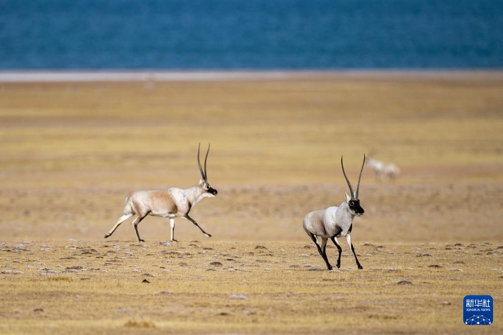在羌塘國家級自然保護區(qū),兩只雄性藏羚羊為爭奪交配權而相互追逐(12月16日攝)。新華社發(fā)(旦增努布 攝)