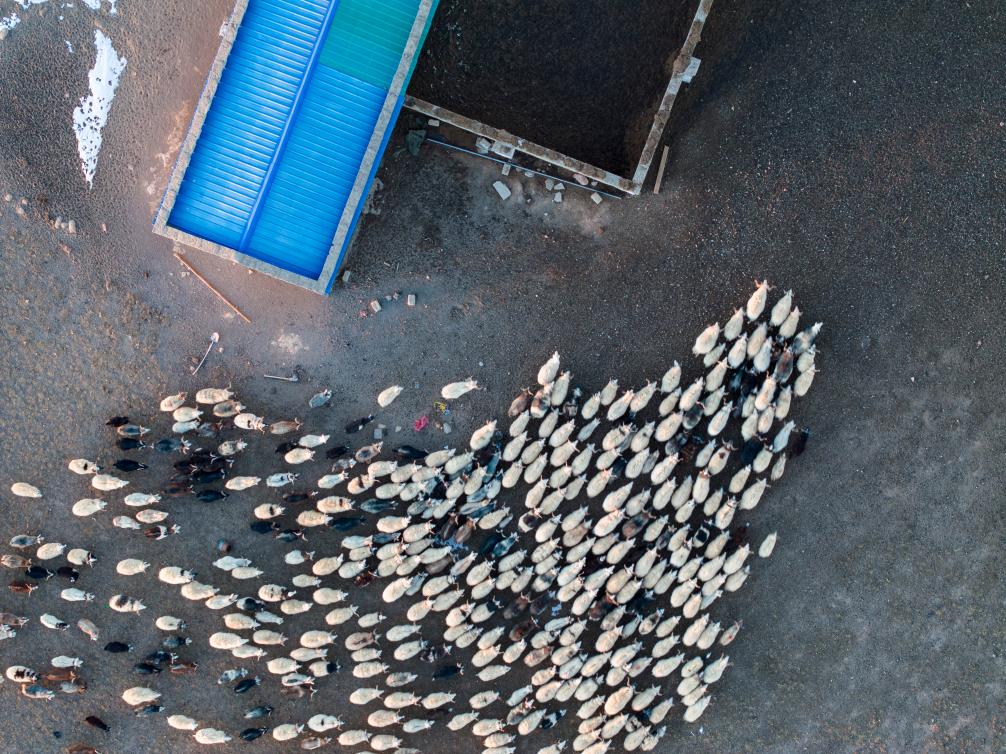 丹增家的羊正進(jìn)入新羊圈(12月18日攝,無(wú)人機(jī)照片)。新華社記者姜帆 攝
