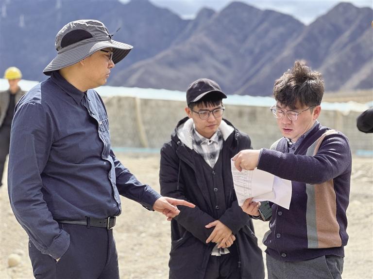 王宇(右一)在援藏項(xiàng)目現(xiàn)場核對施工圖紙。圖由王宇提供