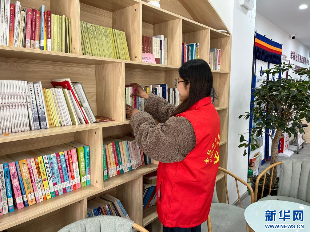 在西藏拉薩市功德林街道,幸福社區(qū)的“全科社工”強(qiáng)珍正在整理黨群服務(wù)中心的書籍(11月26日攝)。新華社發(fā)(德央 攝)