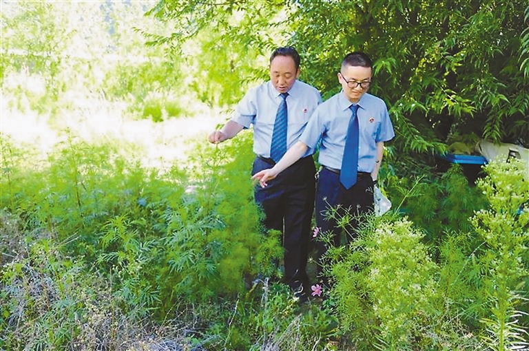 朗縣人民檢察院在辦理督促防治外來物種印加孔雀草行政公益訴訟案期間,檢察官對印加孔雀草的生長區(qū)域進(jìn)行摸排。