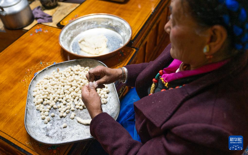 巴桑普尺在制作“古突”(1月10日攝)。新華社發(fā)(普布次仁 攝)